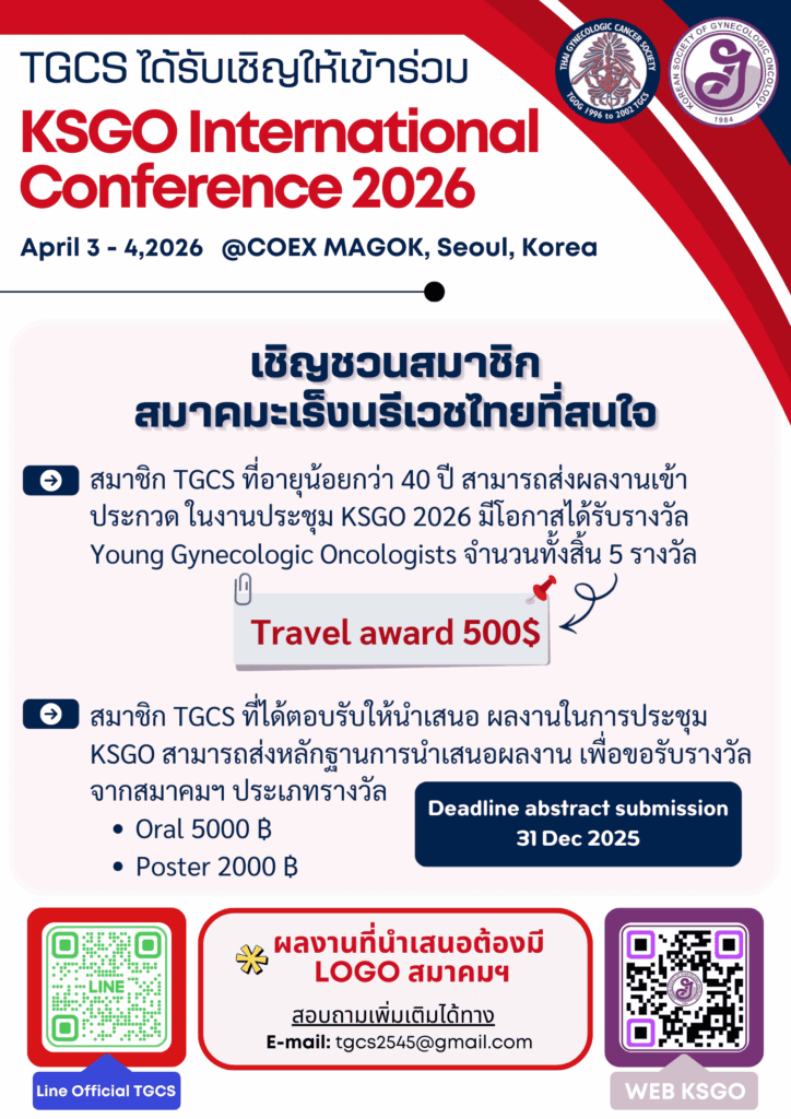 ✨สมาคมมะเร็งนรีเวชไทย (TGCS) ขอเชิญชวนสมาชิกส่งผลงานเข้าร่วมประชุม KSGO International Conference 2026 ระหว่างวันที่ 3–4 เมษายน 2569 ณ กรุงโซล ประเทศเกาหลีใต้ เพื่อเผยแพร่ผลงานและสร้างความร่วมมือทางวิชาการกับนานาชาติ